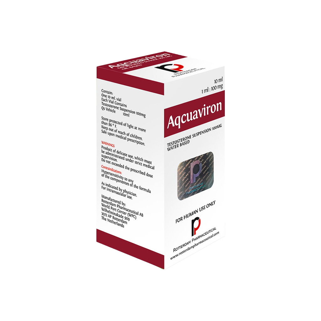 Aqcuaviron es testosterona pura diluida en agua, sin ésteres añadidos, esto la convierte en una sustancia de vida corta de 1 a 2 días, y se aplica muy seguido.